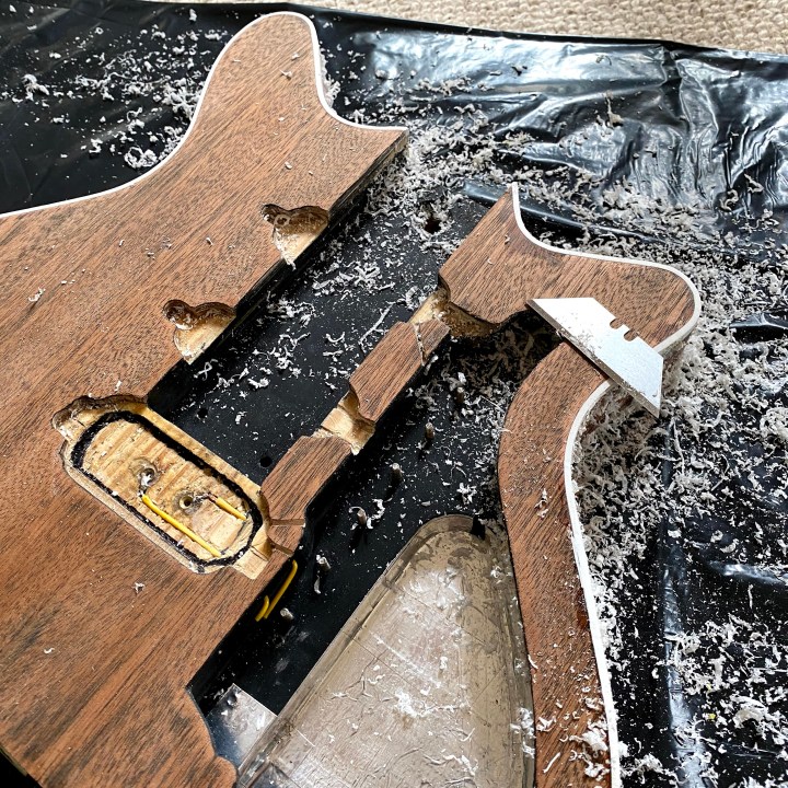 Inevitably, minor repairs are required with such an intricate process. Small gaps can be filled with a mixture of purfling dissolved in acetone or with a white epoxy putty such as Milliput. In this case, the body wood and veneer at the apexes adjacent to the neck mortise are untidy and will require attention before moving forward to the staining and lacquering.