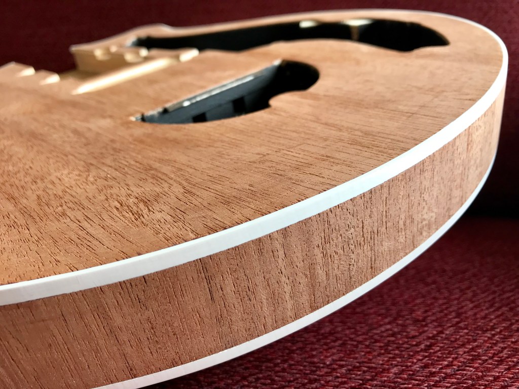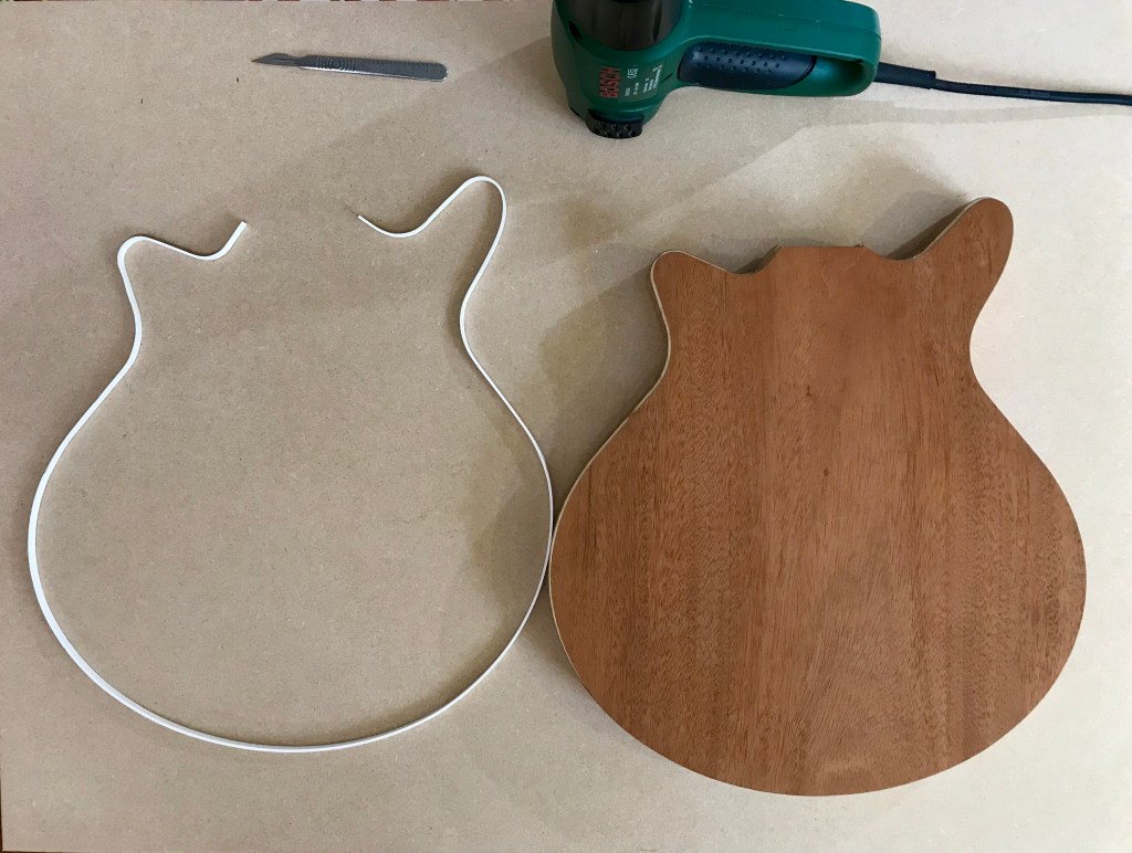 The edge binding stage is one of the trickier jobs on the build and there are several pitfalls. Applying heat to shape the binding on the final guitar body should be avoided because it can shrink the delicate side veneer. Application of excessive heat should be avoided because this will soften the plastic such that it can suffer indentations, e.g. from fingernails and become misshapen.