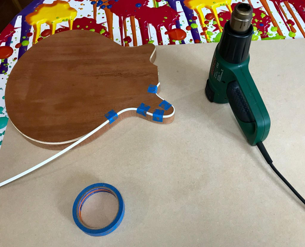 Pre-shaping the plastic edge binding using an electric heat gun prior to gluing makes fitting it to the final body much less awkward. I fed the binding onto it with intermittent application of heat from the heat gun on its lower setting to soften the plastic just enough to make it workable. When it was correctly shaped/stress relieved to a section, I taped it in place and continued to work around the body.
