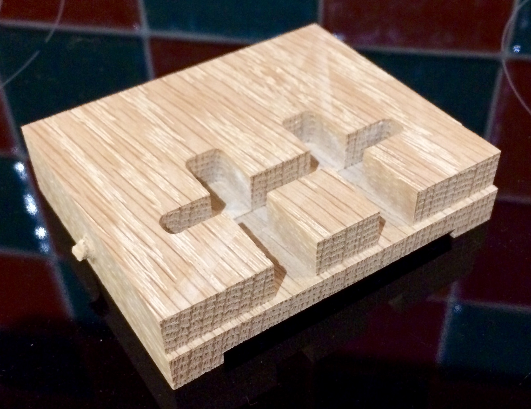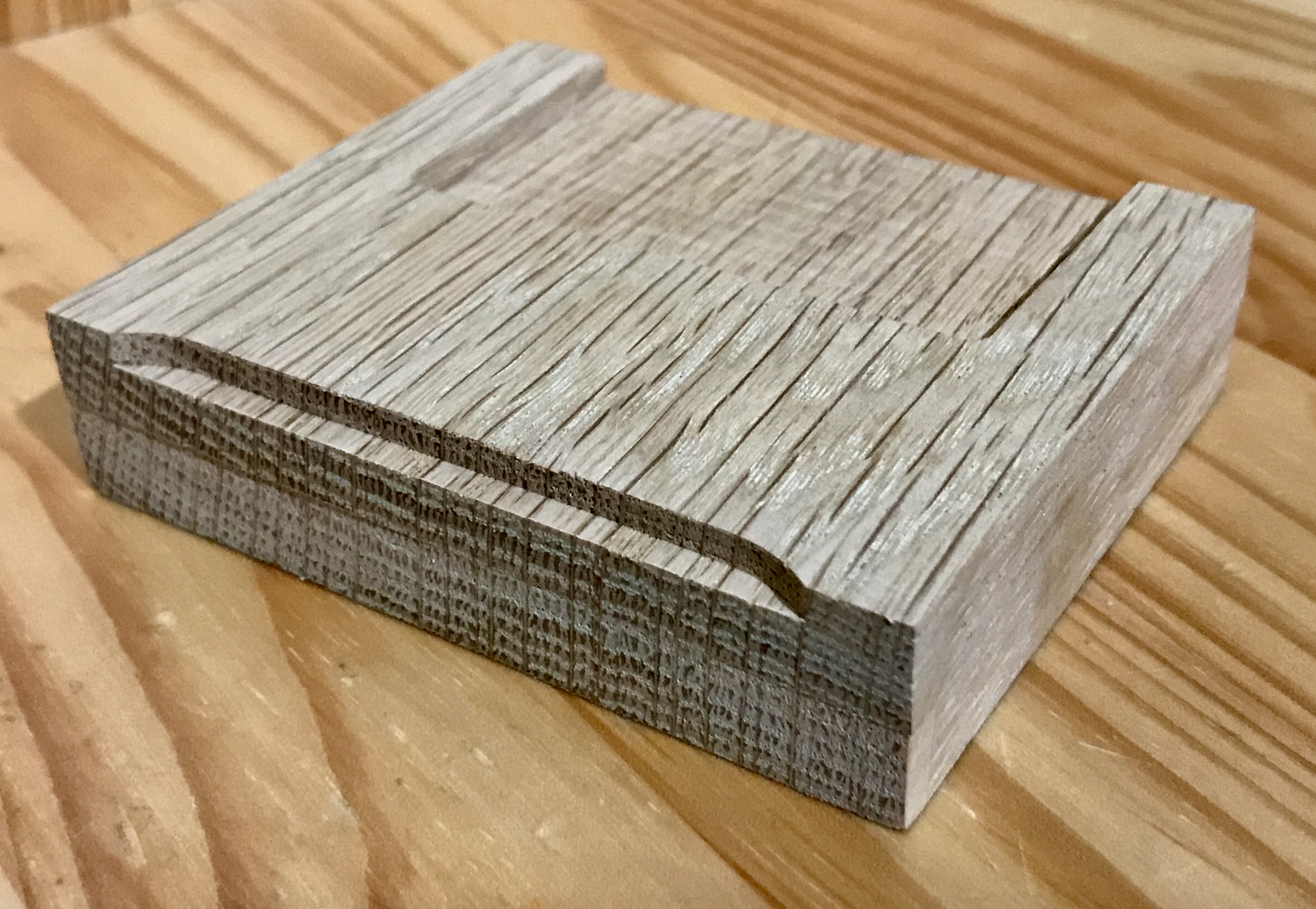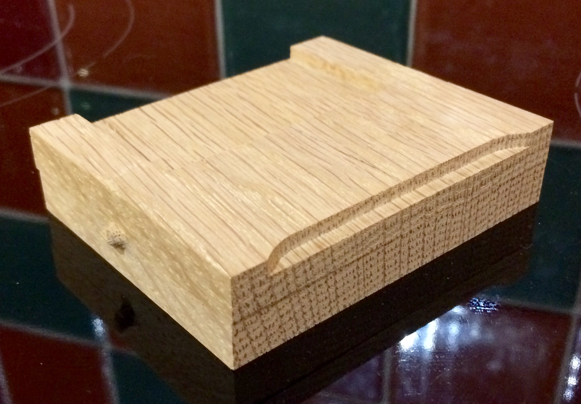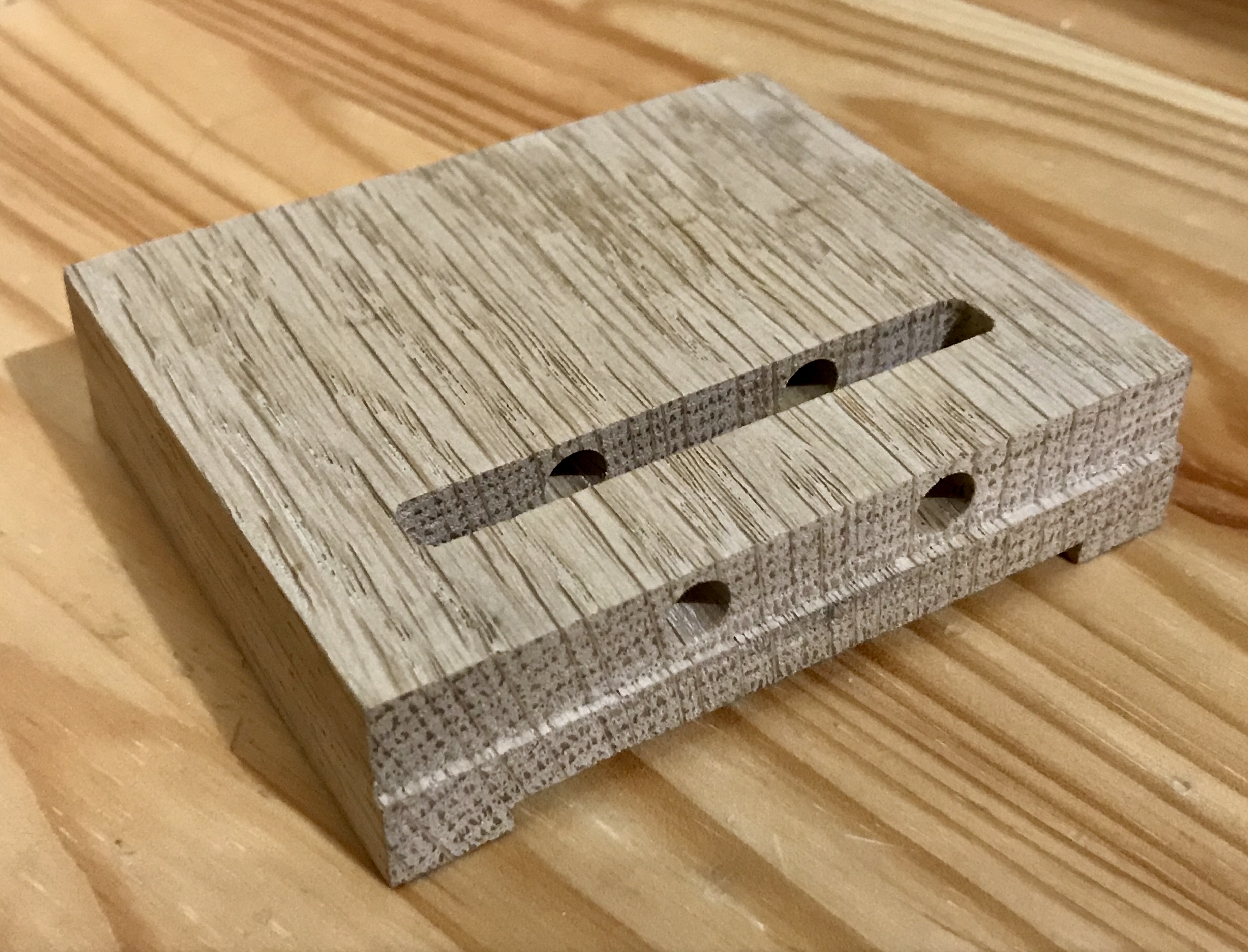 One of the first cuts I did (on 19th December 2016) when I got my Stepcraft CNC machine assembled and mechanically tuned so that it cut accurately and without losing steps was the small oak insert in the upper body section. The knife edge plate and tremolo bolt retainer bar are installed in this piece. My original design involved routing out square section rebates for the 1/4″ diameter bolts to pass through (as most other Red Special builders do) but it seems logical that Brian simply drilled 1/4″ or slightly larger channels so I also worked up a design with this feature. See the various pictures in the gallery below.