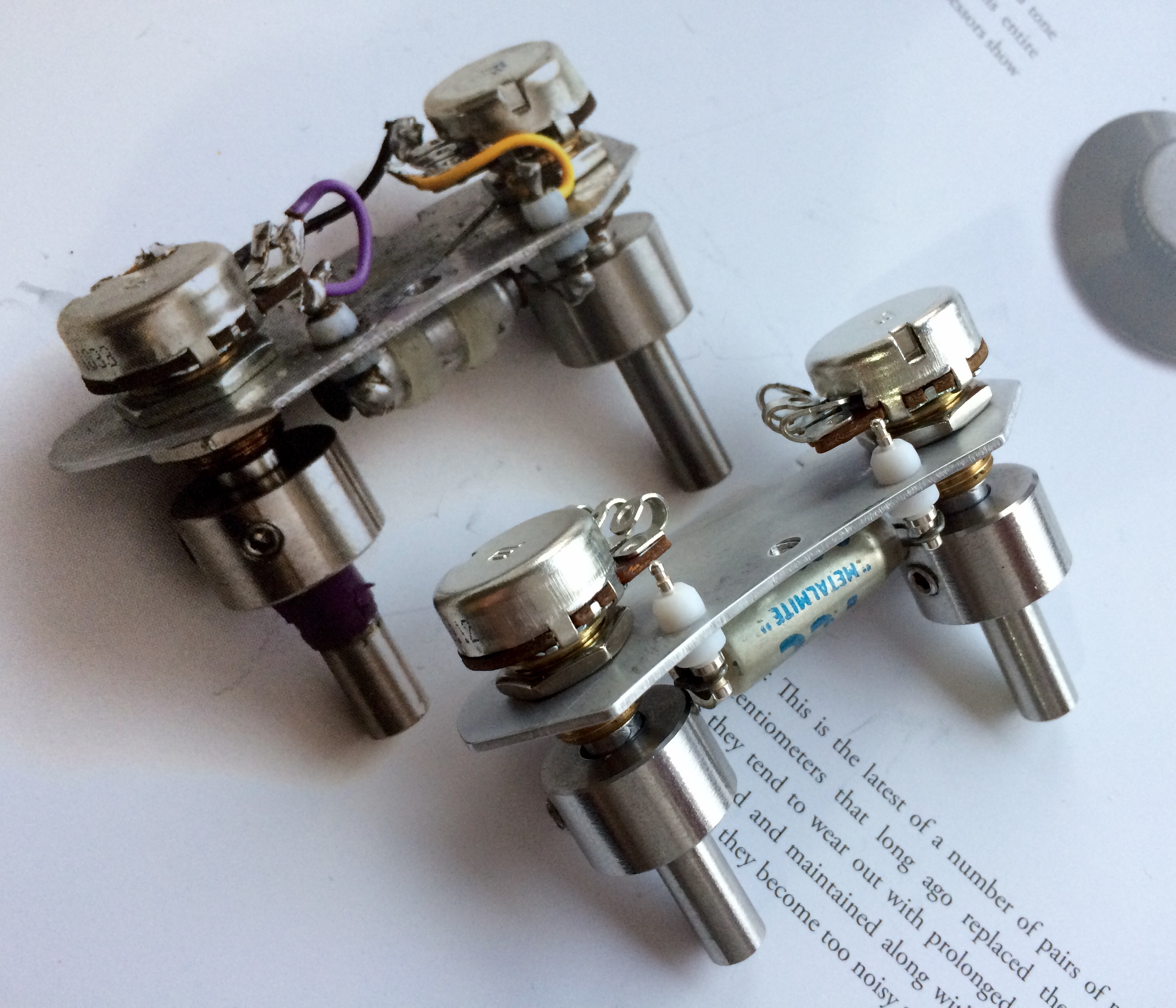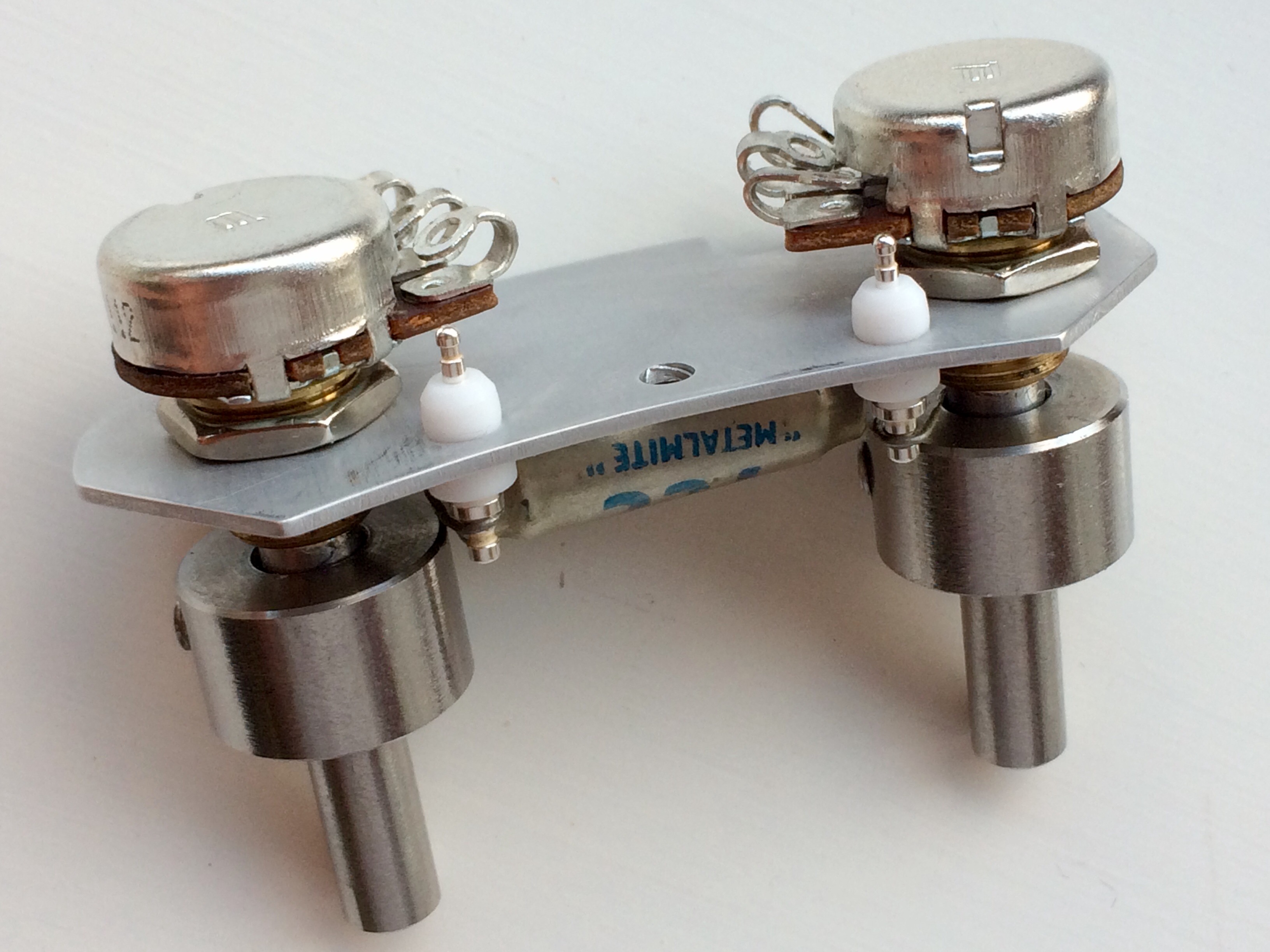 The picture gallery below contains images of the results of this process. I used my rough cut guitar body assembly to test fit the first switch frame attempt. The gallery also contains two images of a test assembly I did with the Mk 2 pot/cap plates with two Bourns PDB181-GTR02-254A2 guitar potentiometers, a vintage TCC Metalmite CP33N paper-in-oil capacitor and a set of stainless steel KAT pot extenders. In the quest for authenticity, I inserted two silver plated barb cone lock PTFE insulated terminal posts (part #156-WE-SP) of a similar type that Nigel used to wire up Brian May’s Red Special guitar. I bought a quantity of these from Aerco Ltd in Horsham, West Sussex. They are designed for military type applications.