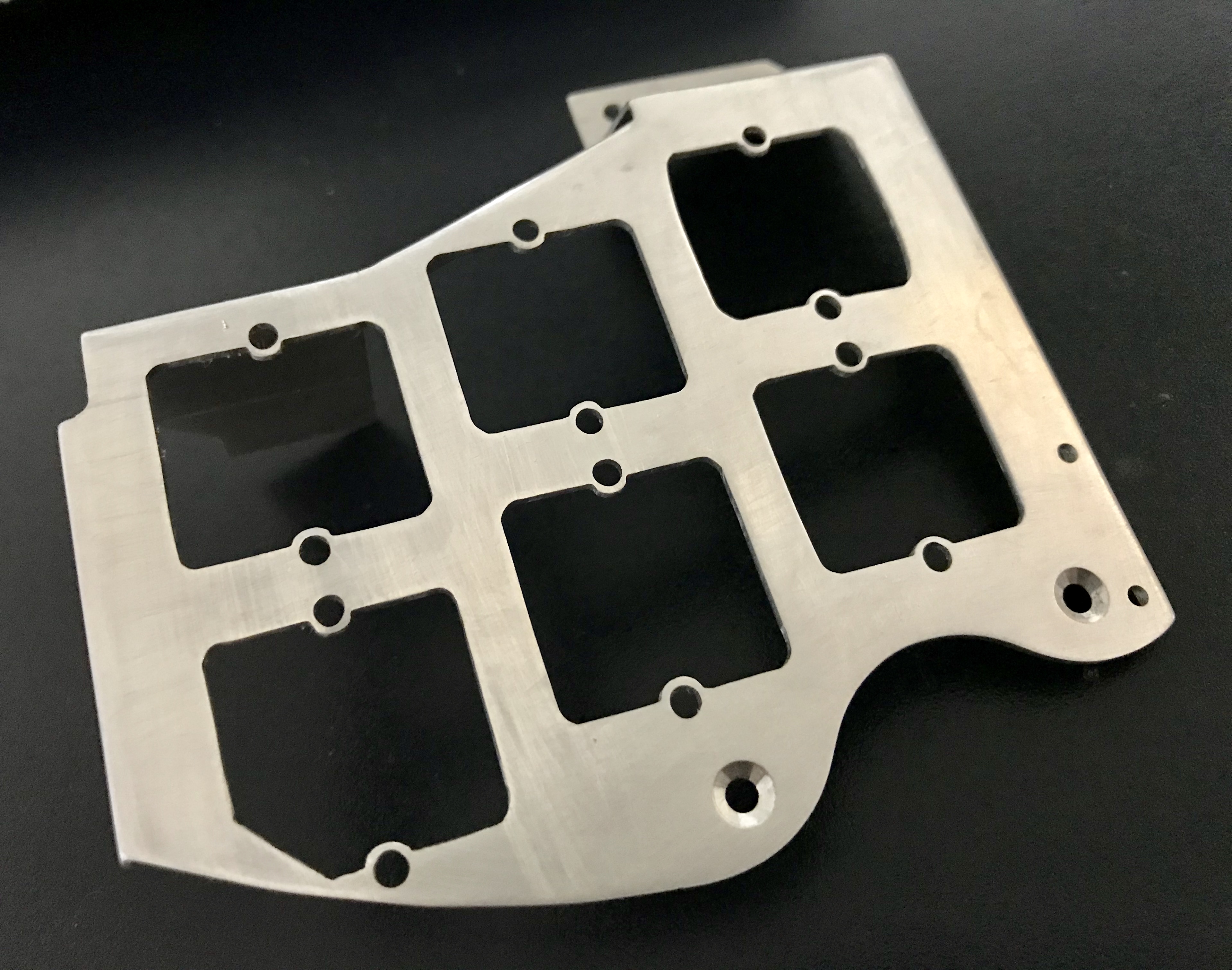 For my first cut attempt, I used a sheet of 1050A grade aluminium sheet from an eBay seller. This grade is almost pure aluminium and did not mill very well because it is too soft and does not generate chips which can be cleared by the cutter. I made a design change to Mk 2 after the test fit revealed that the foot that screws onto the lower body section ledge didn’t protrude far enough. This is the middle frame in the picture of three. The final (Mk 3) design frame is shown on the left and has a wider foot. This was supplied to Nigel Knight to wire up.