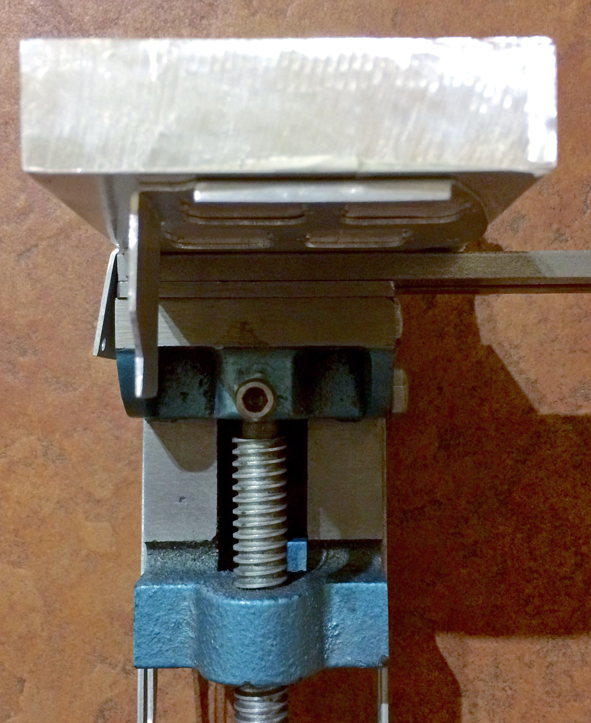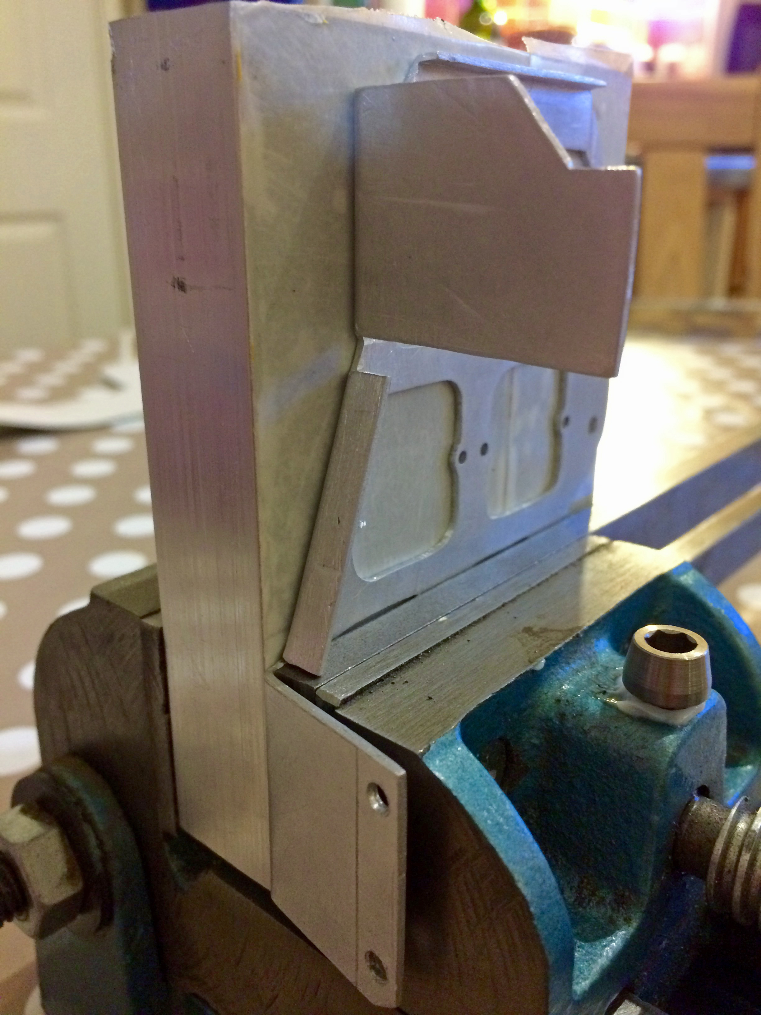 A successful outline cut of the foldable net for the aluminium switch frame is only half the work becuase folding the tabs over is quite challenging. For my first attempt, I fashioned a bending brake using a vice, an aluminium block and some mild steel bars. I probably should have heated up the aluminium sheet to make it more malleable but I didn’t have a gas torch at this stage of the project. Later on, I designed and successfully CNC cut a bending former from an offcut of 20 mm thick 6082T6 grade aluminium block.