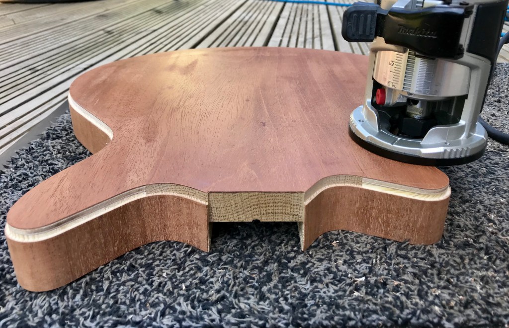 - Router. Although hobby class CNC machines like my Stepcraft 2/840 are now relatively affordable (the price of a quality guitar), most DIY guitar builders will not own one or have ready access to one. Professional joiners and carpenters I have met often recommend Makita hand tools. These are made in Japan to a high standard and will last a long time if looked after. I used a Makita RT0700CX4 laminate trimmer to cut the edge binding rebates. If I did not have a CNC machine, I would have had perspex templates laser cut and made the body by drilling and routing the outline and chambers using my drill press then a Makita brand hand held router with bearing guided Trend brand carbide tipped cutters and flush trim router bits.