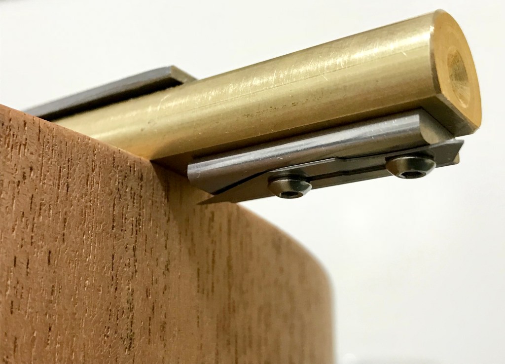 I made some bespoke tools myself to make some tasks simpler. These included a piece of aluminium sheet with radiused holes drilled out of two vertices to round over the binding edge and a gramil (inspired by the Schneider gramil from Luthiers Mercantile International) to score the veneer edges at 2 mm in from the edge and 4 mm down from the top.