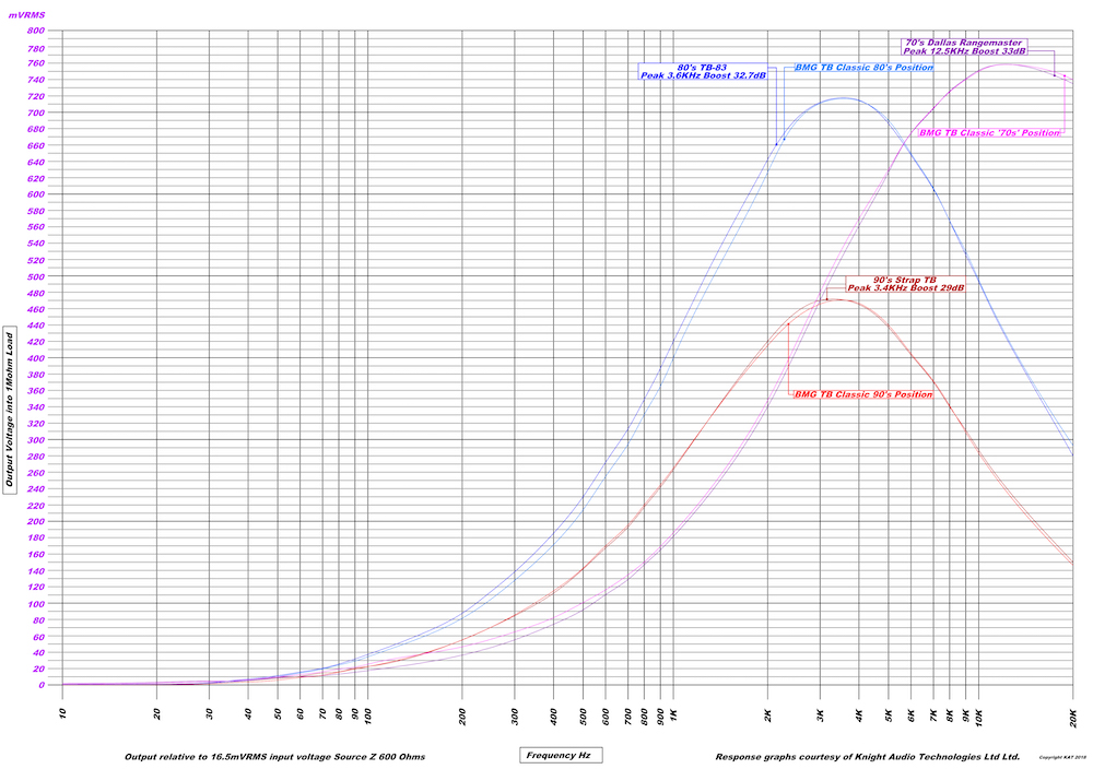 • Fattest sounding and most output level of the 3 Fryer ‘no knobs permanently plugged-in’ pedals TB Touring, TB Super and TB Deluxe.
